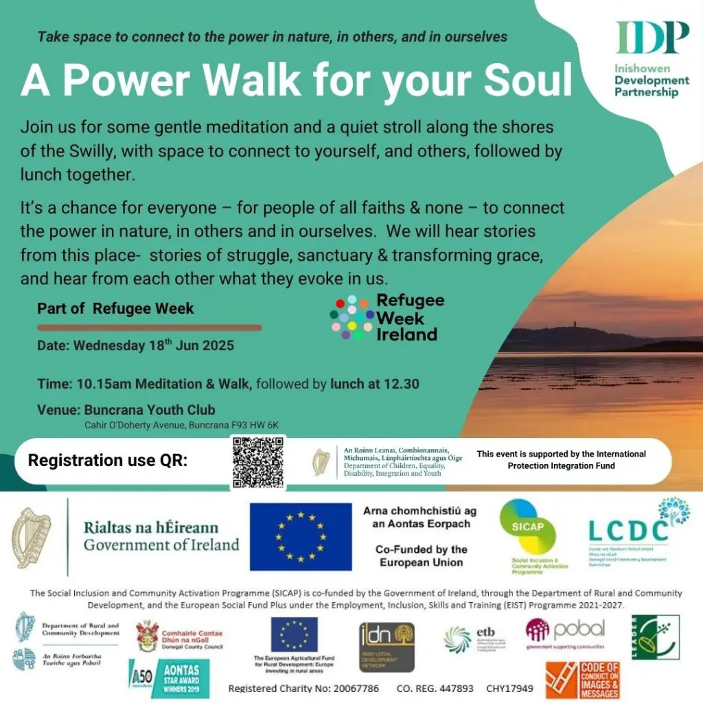 Inishowen Development Partnership (IDP) is inviting the community to join “A Power Walk for Your Soul”, a gentle, reflective event taking place on Wednesday, June 18th in Buncrana. It’s one of several activities to create spaces where people from different backgrounds can get to meet, connect and get to know each other.