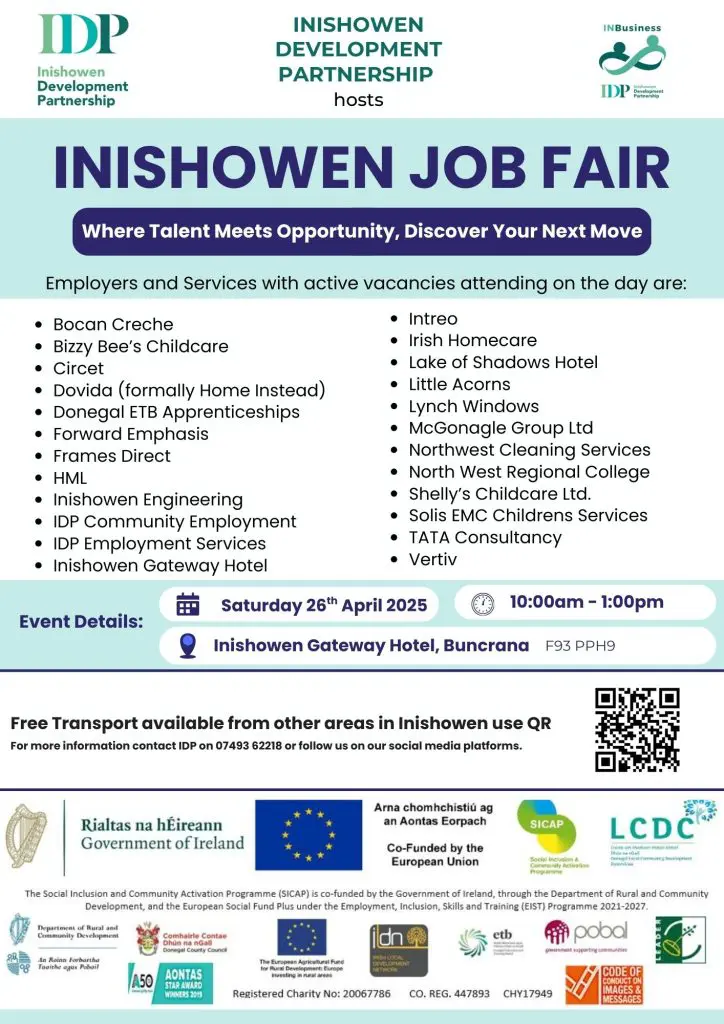 IDP is also providing free transport from Moville, Carndonagh, Ballyliffin, Muff and Burnfoot, to ensure the Job Fair is accessible to everyone in the peninsula.