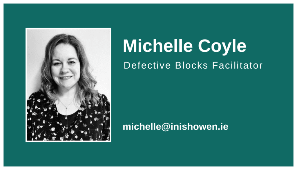 DCB/MICA facilitators Michelle Coyle & Anne Marie Lyons work with IDP’s local interagency IFAN DCB/MICA subgroup to ensure that they are reaching families who need this support most. They also link with local agencies, community groups, support services and key organisations involved in supporting people affected by Defective Concrete Blocks. It is clear that the community support on the ground continues to be vital for households, and the outreach clinics further enhance this work.
