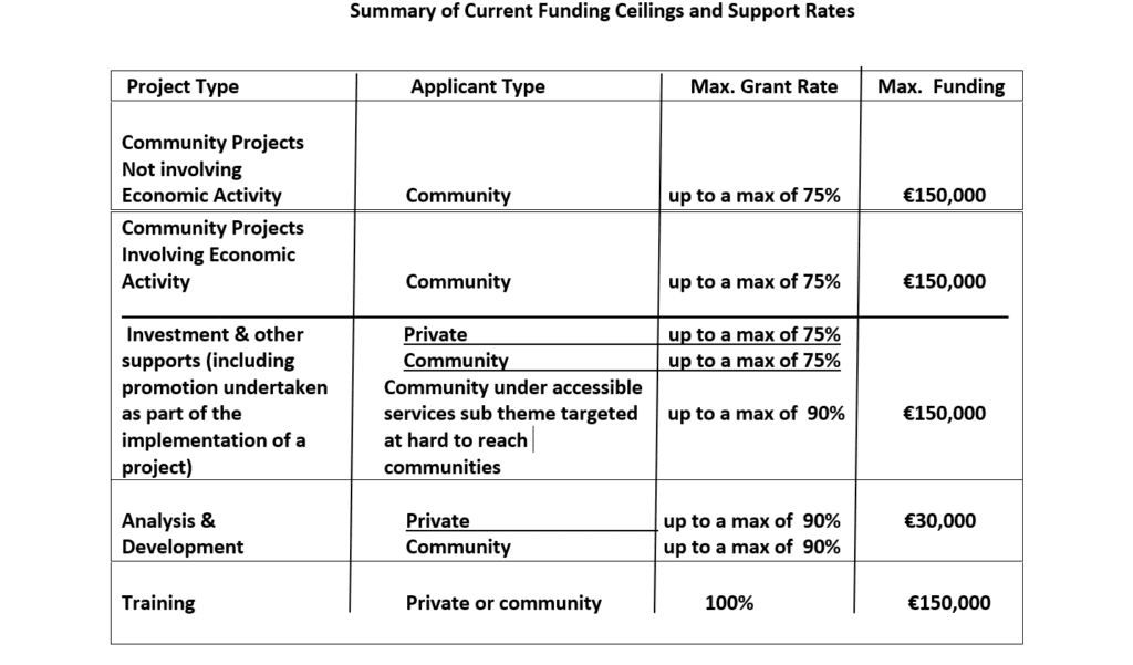 The table below sets out the maximum LEADER grant aid that may be awarded for various project types: